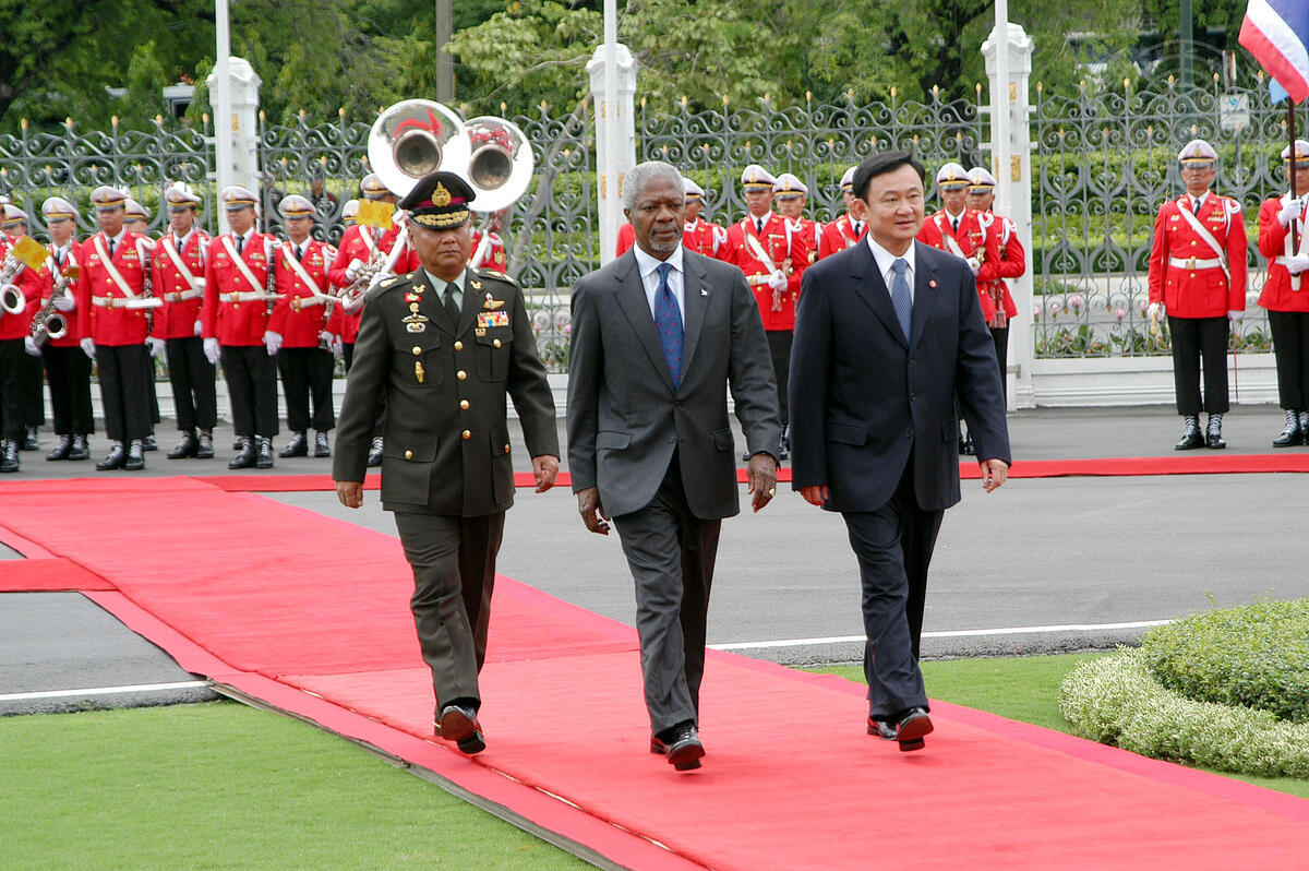 Secretary-General Kofi Annan (centre) is welcomed to Government House by Prime Minister Thaksin Shinawatra (right) in the presence of a full military honour guard.