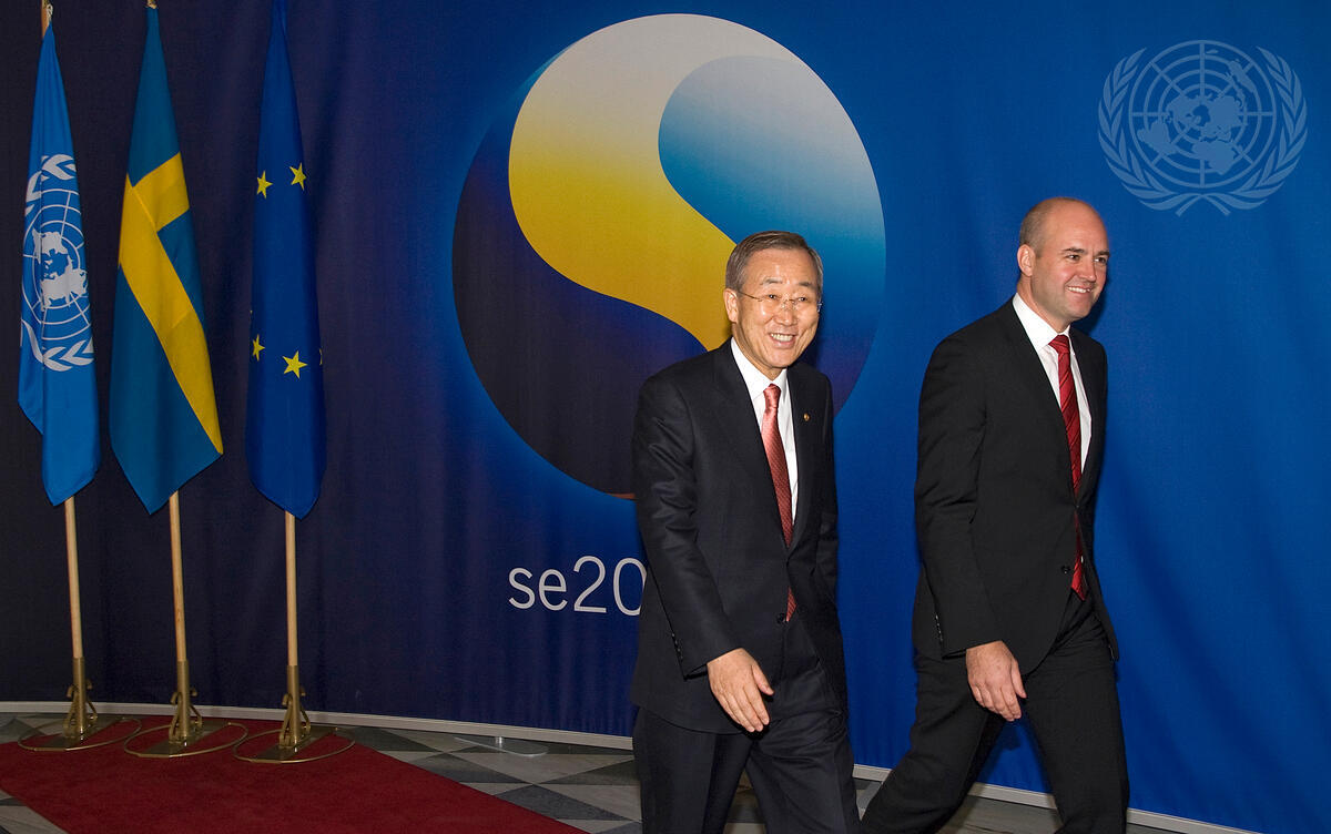Secretary-General Ban Ki-moon (left) meets with Fredrik Reinfeldt, Prime Minister of Sweden, in Stockholm, Sweden.
