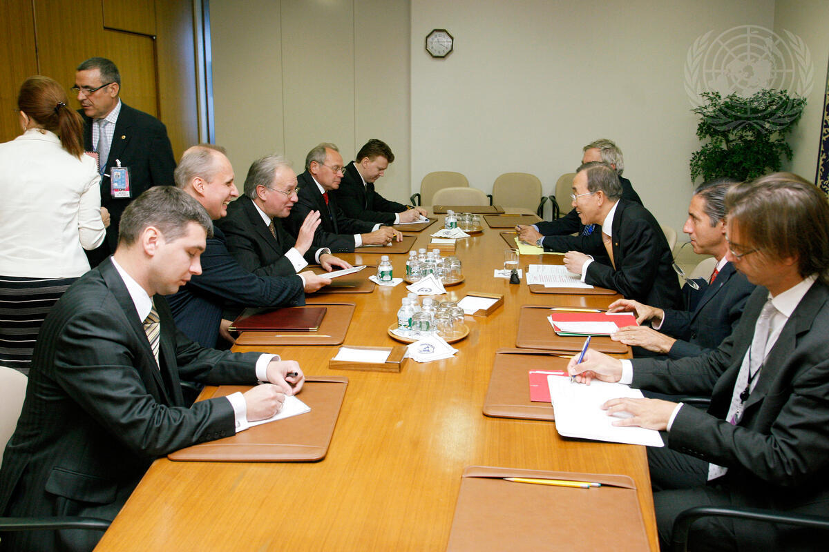 Secretary-General Ban Ki-moon (third right) meets with Sergei N. Martynov (third, left), Foreign Minister of Belarus.