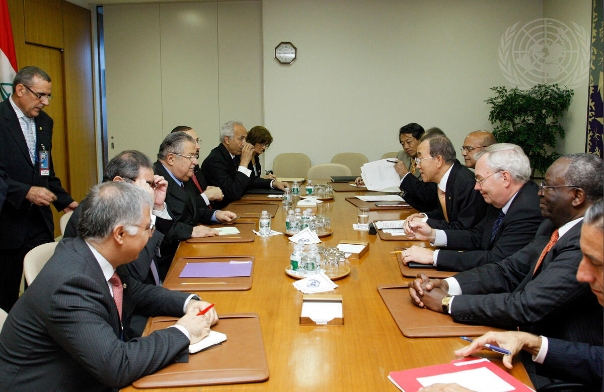 Secretary-General Ban Ki-moon (centre, right) holds a meeting with Jalal Talabani (centre, left), President of Iraq.