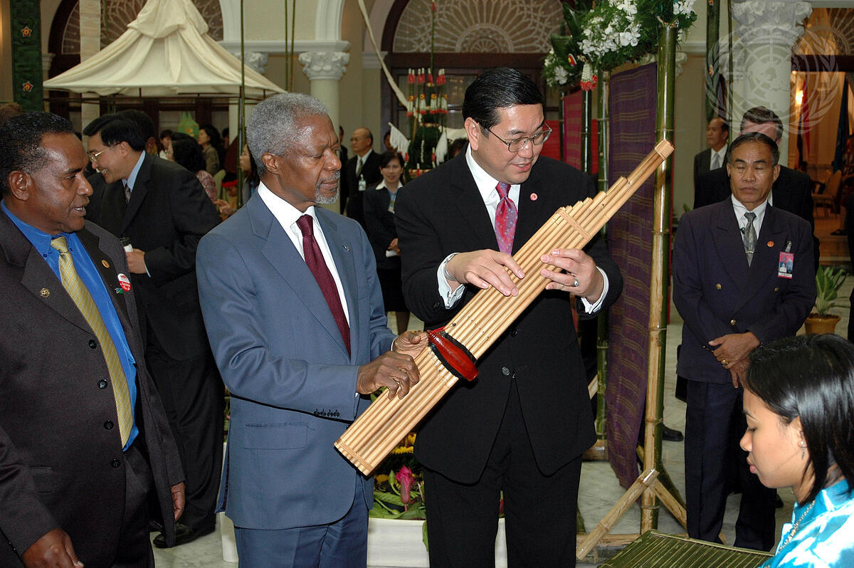 Secretary-General Kofi Annan (second from left) visits Thai Government House, escorted by Surakiart Sathirathai (right), Foreign Minister of Thailand, as they admire a display of Thai crafts and musical instruments.