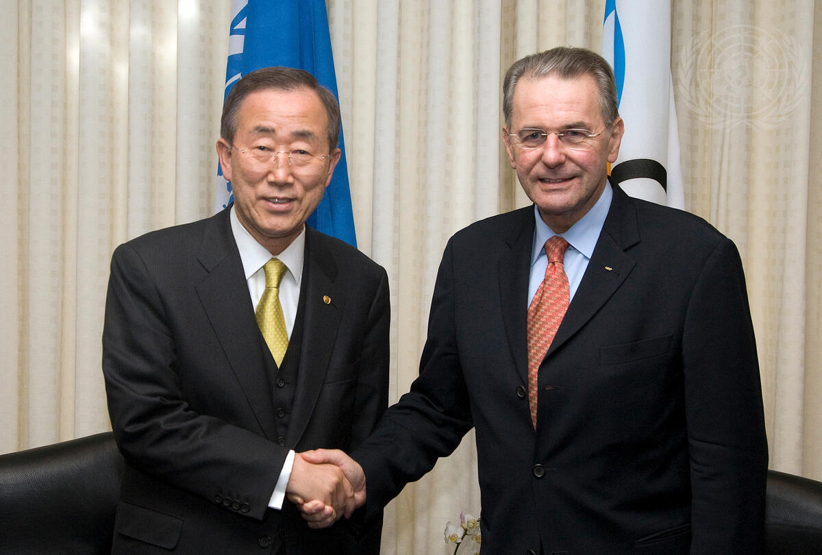 Secretary-General Ban Ki-moon (left) meets with Jacques Rogge, President of the International Olympic Committee (IOC).