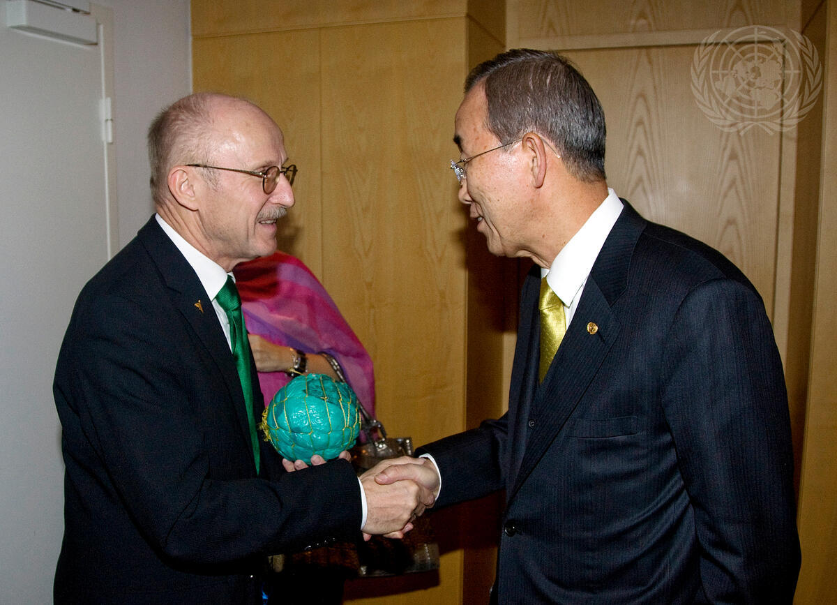 Secretary-General Ban Ki-moon (right) meets with Wilfried Lemke, his Special Adviser on Sport for Development and Peace. Mr. Lemke holds a hand-made soccer ball which will be auctioned by UN Messenger of Peace Princess Haya Bint Al Hussein of Jordan at a fundraising event for families of UN staff killed in action.