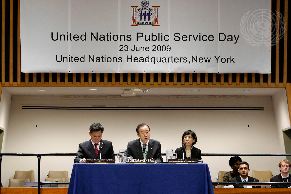 Secretary-General Ban Ki-moon (centre, at podium) addresses a Public Service awards ceremony on the occasion of the obsevance of the United Nations Public Service Day.