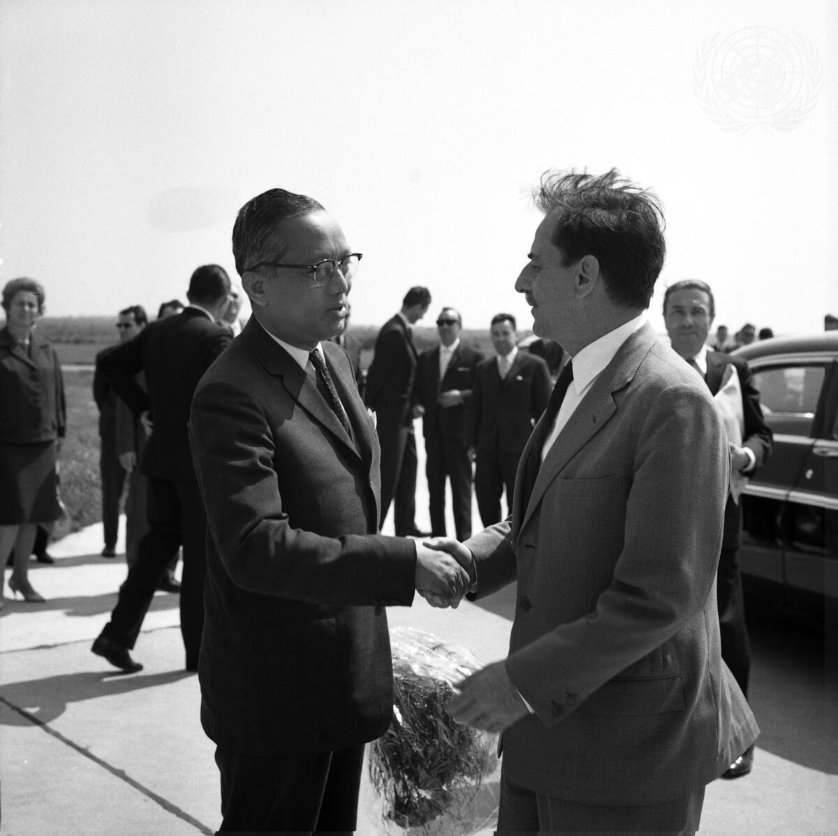 UN Secretary-General U Thant (left) taking leave of Mr. Koca Popovic, Secretary of State for Foreign Affairs at the airport at Pula before his departure by plane for Rome.