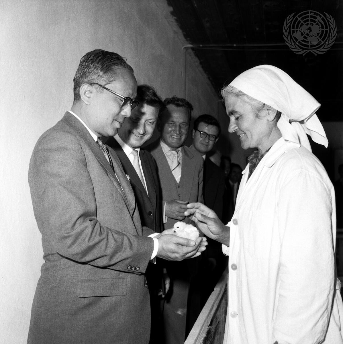 UN Secretary-General U Thant (left) examines a chick in the poultry section of the collective farm of Cumpana in the Dobrogea region.