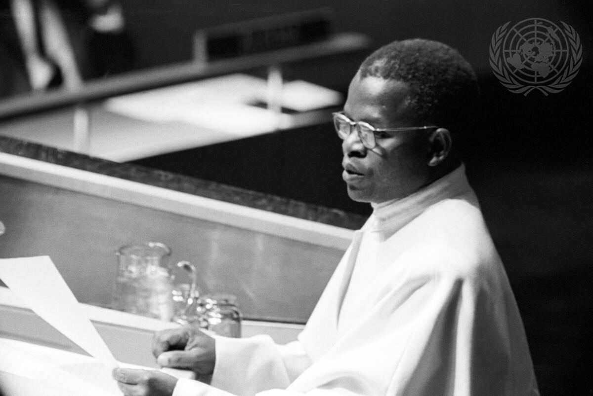 Before going to the agenda, the Assembly heard an address by President Youlou of the Republic of the Congo (Brazzaville). Mr. Youlou is seen here at the speaker's rostrum addressing the Assembly.