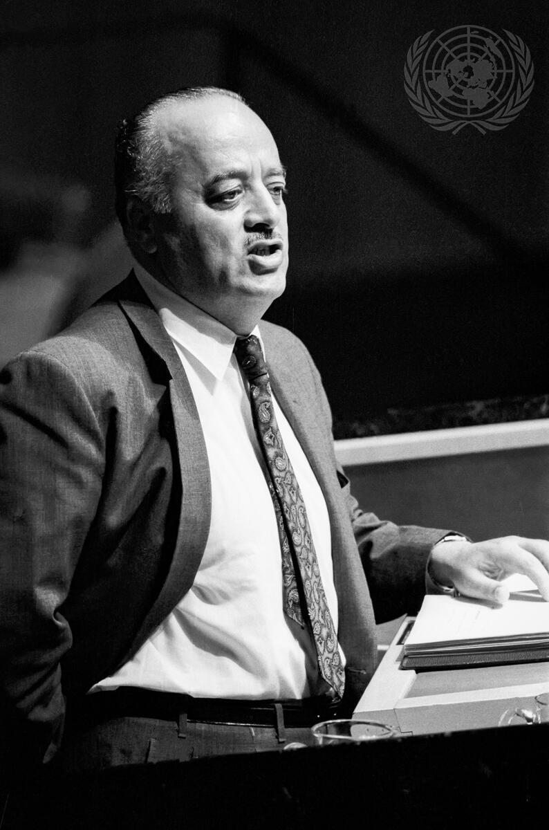 Here, Mr. Ahmad Shukairy, Saudi Arabia's Minister of State for United Nations Affairs and Permanent Representative to the United Nations, is seen at the speaker's rostrum addressing the Assembly this morning.