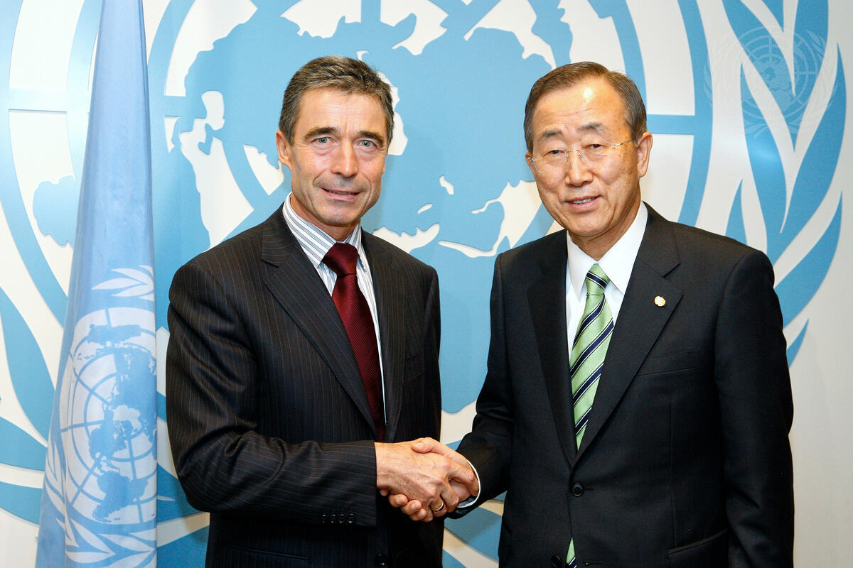 Secretary-General Ban Ki-moon (right) meets with Anders Fogh Rasmussen, Secretary General of the North Atlantic Treaty Organization (NATO).
