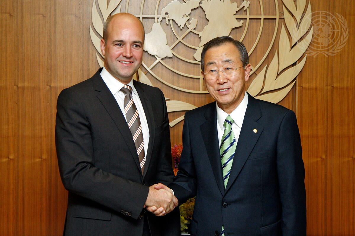 Secretary-General Ban Ki-moon (right) meets with Fredrik Reinfeldt, Prime Minister of Sweden.
