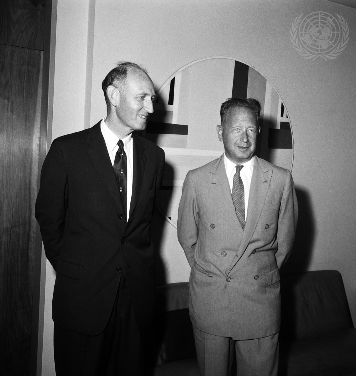 This photograph taken in the Secretary-General's office shows Ambassador James Plimsoll (left), new Permanent Representative of Australia to the United Nations, and UN Secretary-General Dag Hammarskjöld.