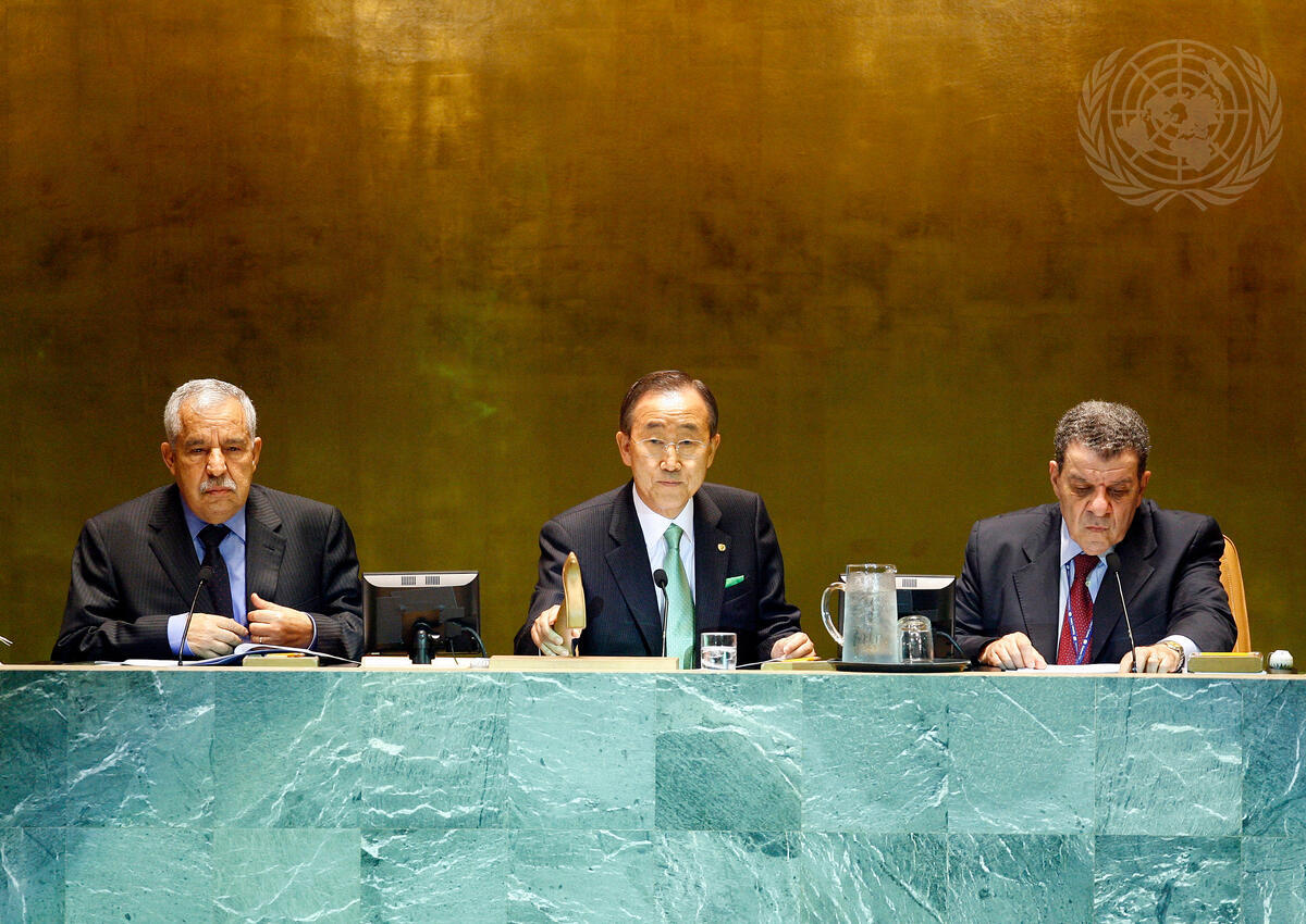 UN Secretary-General Ban Ki-moon (centre) opens the plenary session of the Summit on Climate Change. At his side are Ali Abdussalam Treki (left), President of the sixty-fourth session of the General Assembly, and Muhammad Shaaban, Under-Secretary General for General Assembly Affairs and Conference Management. Convened by Secretary-General Ban Ki-moon, the Summit aims at mobilizing the highest level political will needed to reach a fair, effective, and scientifically ambitious global climate deal at the United Nations Climate Change Conference in Copenhagen this December.