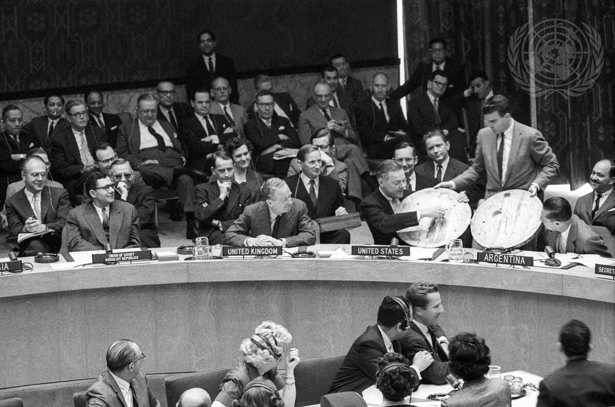 Here is a view of the Council chamber as Ambassador Henry Cabot Lodge (2nd from right, at desk), of the United States, addressed the meeting.