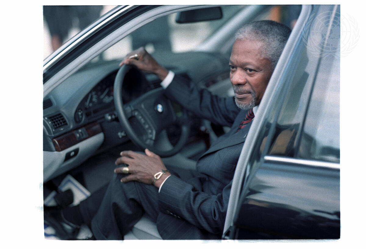 Secretary-General Kofi Annan, seated in the armoured vehicle, presented to him today at UN