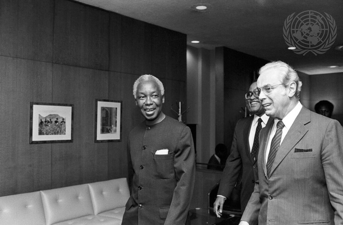 Secretary-General Javier Perez de Cuellar (right) meeting with President Julius Nyerere of the United Republic of Tanzania at UN Headquarters.