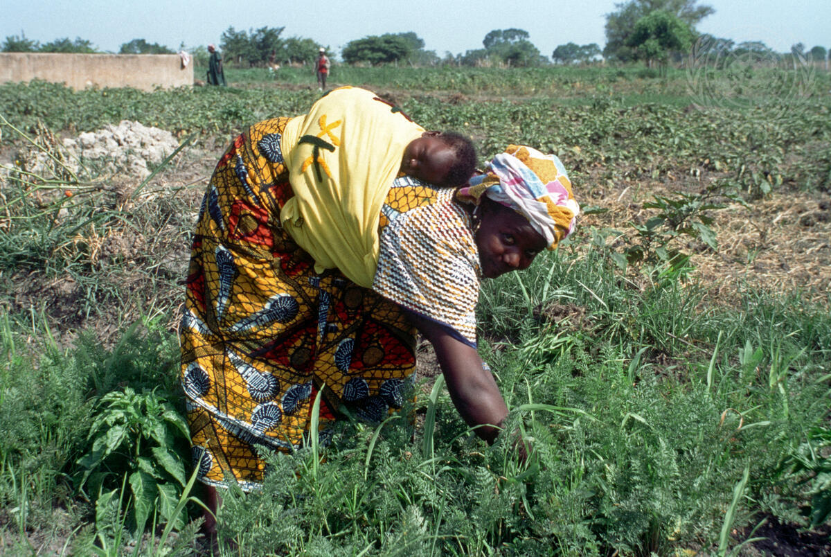 A mother, with her child resting on her back, works in the fields of Balandougou in Guinea.