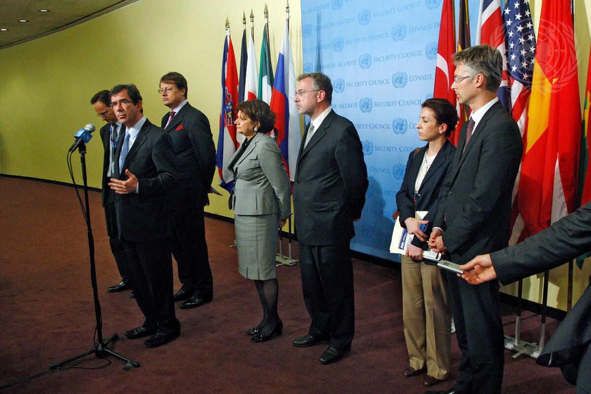 Jean-Maurice Ripert, Permanent Representative of France to the United Nations, briefs journalists after the Security Council failed to extend the mandate of the United Nations Observer Mission in Georgia.