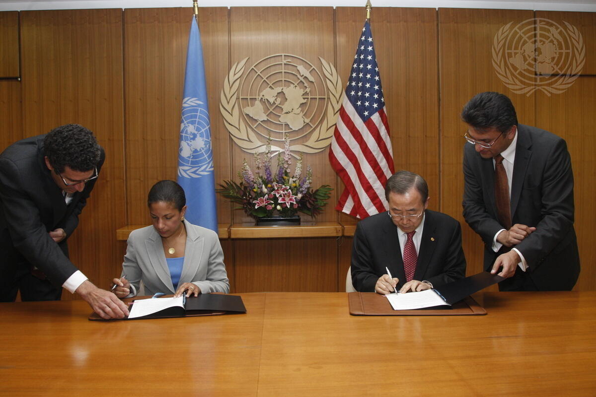 Secretary-General Ban Ki-moon (right, seated) and Susan E. Rice, Permanent Representative of the United States of America to the United Nations, sign the fourth supplemental of the United Nations Headquarters agreement with the host country.