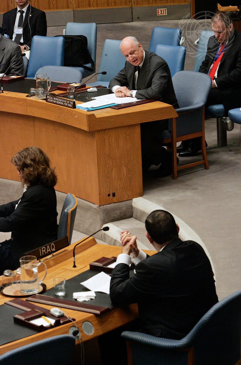 Staffan de Mistura (second from right), Special Representative of the Secretary-General and Head of the United Nations Assistance Mission in Iraq (UNAMI), addresses a Security Council meeting on the situation in Iraq.