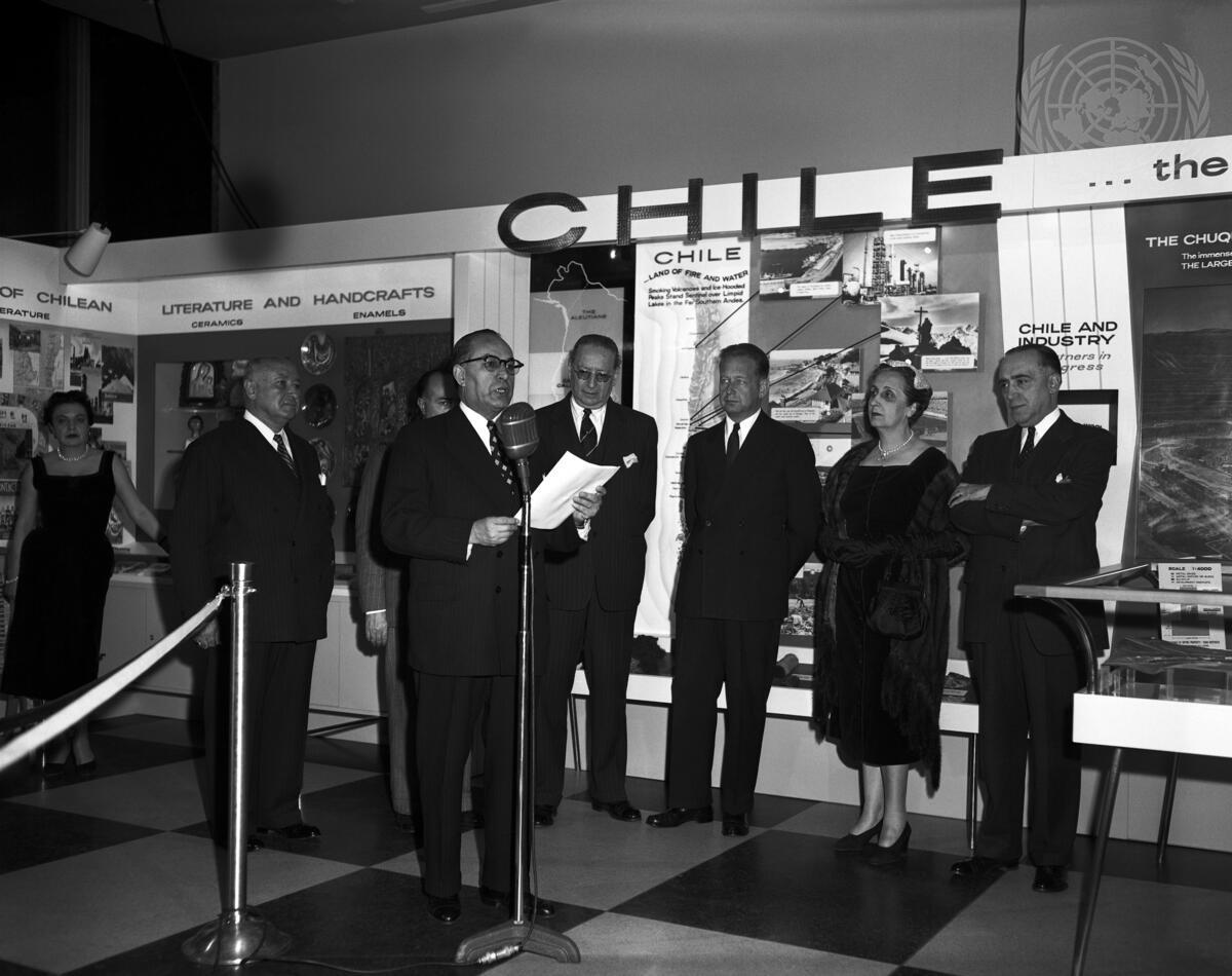 An exhibit of the Republic of Chile was presented in the north lobby of the Secretariat building at United Nations Headquarters this evening by the Permanent Representative of Chile to the U.N., Ambassador Rudecindo Ortega. Among those present at the ceremony were Mr. Jose Maza, President of the General Assembly, Mrs. Maza and U.N. Secretary-General Dag Hammarskjöld. The exhibit, which will be on view through December, illustrates aspects of the culture, industries and life of Chile. It includes examples of Chilean literature, handicrafts, textiles and agricultural products.
