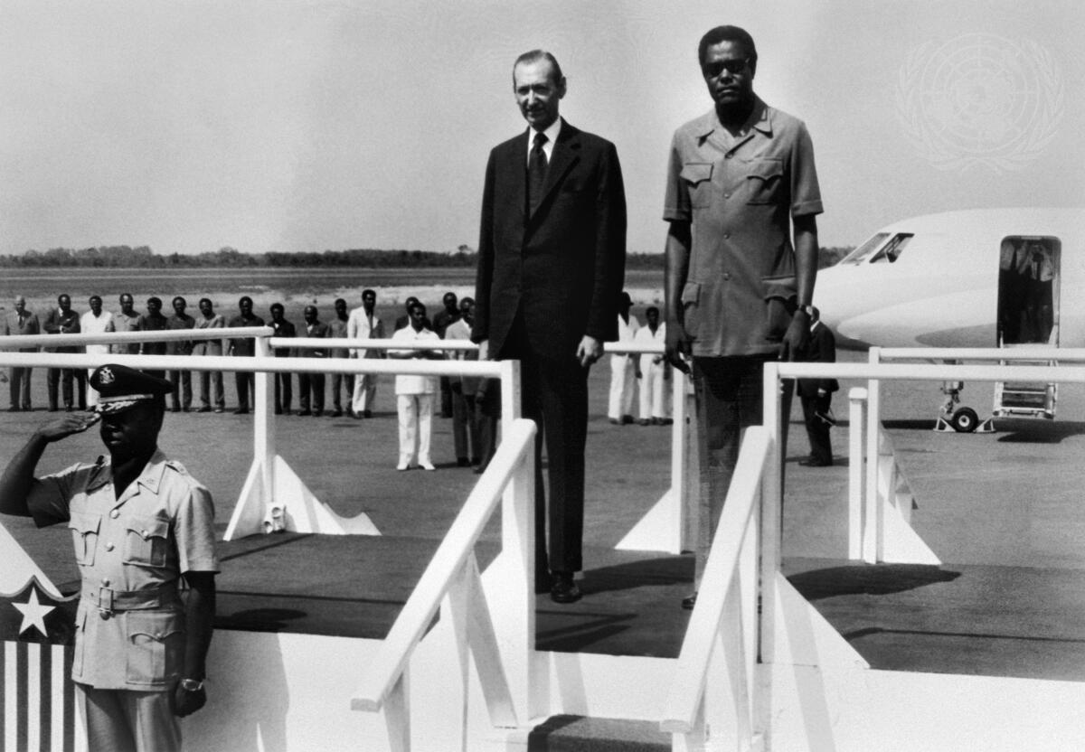 Secretary-General Kurt Waldheim and Foreign Minister of Liberia, C. Cecil Dennis, on reviewing stand following arrival at Roberts Field, Liberia.