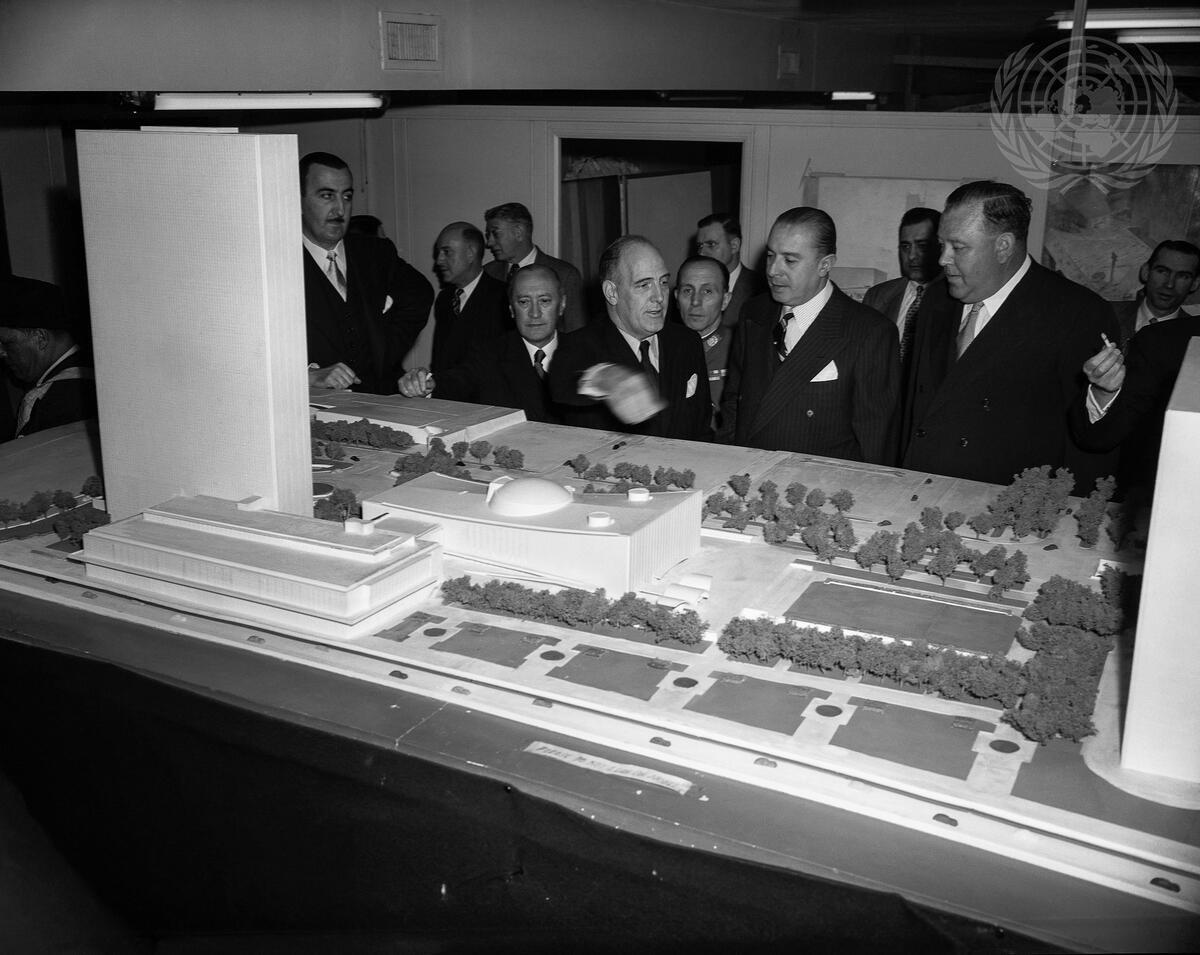The President of the Republic of Chile, Mr. Gabriel Gonzalez Videla (centre); U.N. Secretary-General Trygve Lie (right) and Mr. Wallace K. Harrison, Director of U.N. Headquarters Planning, as the latter shows the visiting President a scale model of the Permanent U.N. Headquarters now under construction.