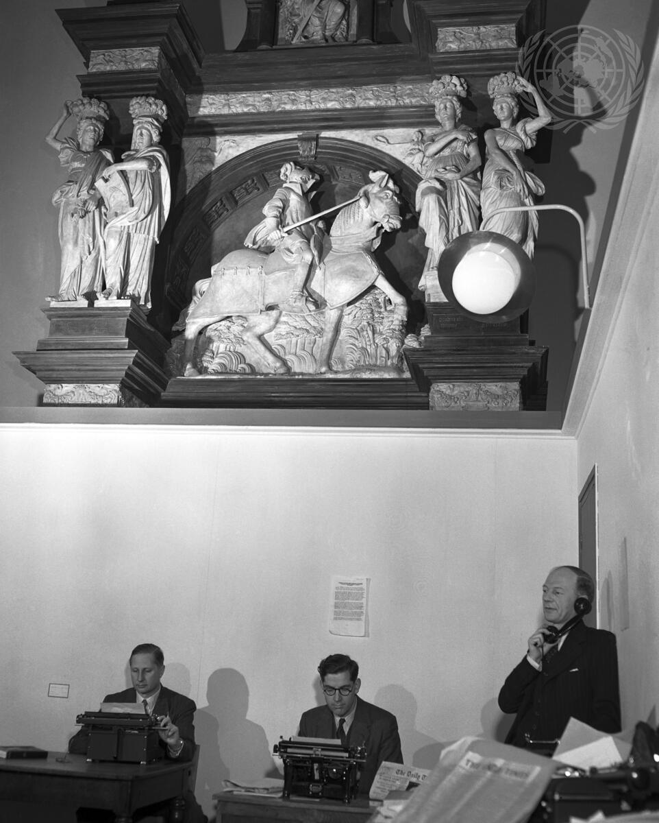 The Manchester Guardian and the Kemsley Press news agencies are seen here at work with a plaster cast of the tomb of Brézé, a masterpiece from the Cathedral of Rouen, serving as backdrop.