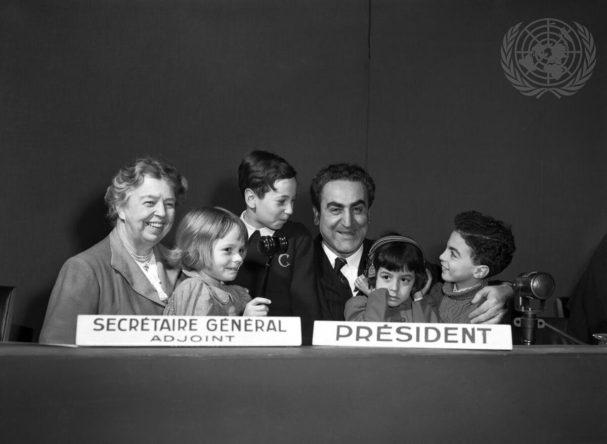 At the Palais de Chaillot, Mrs. Eleanor Roosevelt (USA), left, and Dr. Charles Malik (Lebanon) explain how a meeting is conducted. The children visited the Third Committee of the General Assembly (Social, Cultural, and Humanitarian) of which Dr. Malik is Chairman.