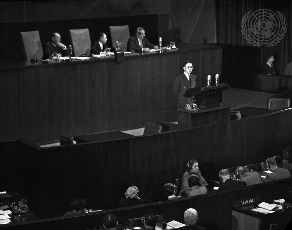 Ambassador Tingfu F. Tsiang, Permanent Representative of China to UN, addresses the delegates to the fifth session of the General Assembly, on the opening day of the Assembly. From left to right, in the rostrum: Mr. Trygve Lie, UN Secretary General, General Carlos P. Romulo, President of the fourth session; Mr. Andrew W. Cordier, Executive Assistant to the Secretary-General.