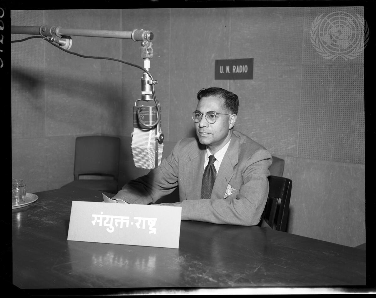 Shamaldharee Lall, Assistant Secretary-General for the Department of Conference and General Services, speaks to the people of India for the first broadcast of a new weekly program of United Nations news in Hindi.