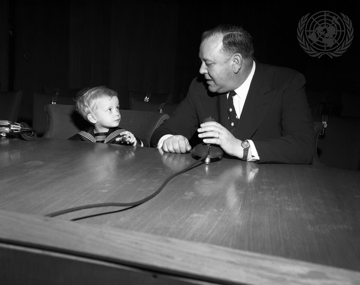 U.N. Secretary-General, Mr. Trygve Lie, demonstrates microphone in one of the U.N. conference rooms to his three-year-old grandson Rangvald Bratz.