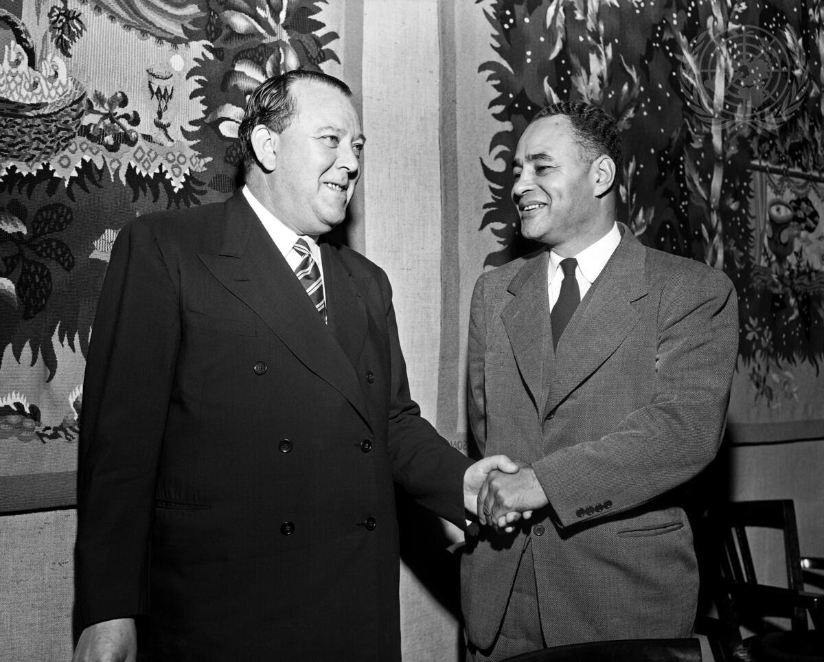 Secretary-General Trygve Lie (left) meets with Dr. Ralph Bunche, Acting UN Mediator for Palestine, during the Third Regular Session of United Nations General Assembly in Paris, France.