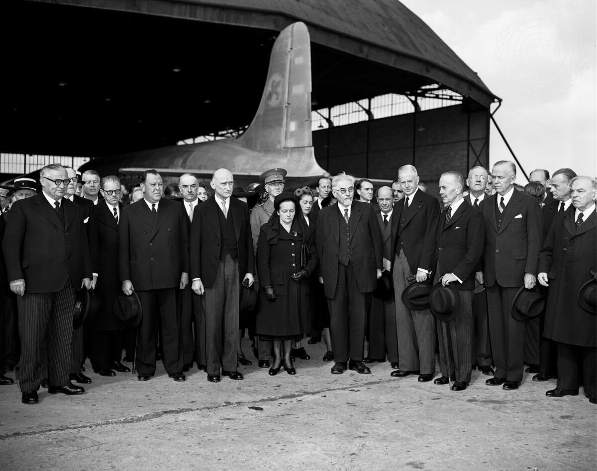 The memorial service for the United Nations Palestine Mediator and his French aide who were assassinated in Jerusalem was attended by United Nations officials and representatives of Member States: Front row, left to right: United Kingdom Foreign Minister, Ernest Bevin; Secretary-General of United Nations Trygve Lie; French Foreign Minister Robert Schuman; Mme Serot, widow of Colonel Serot; French Defence Minister Paul Ramadier; Swedish Ambassador to France Karl Ivan Westman; United Kingdom representative at United Nations Sir Alexander Cadogan; United States Secretary of State George C. Marshall.