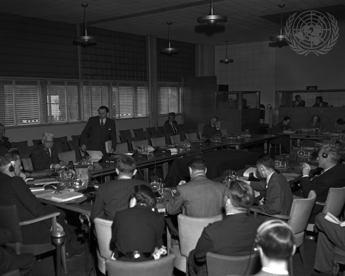 USSR representative Mr. Pavel Chernyshev leaves conference table after the Committee had rejected his proposal to unseat “the representative of the Kuomintang”. The proposal was rejected by a vote of 3 against 1 and 1 abstention.