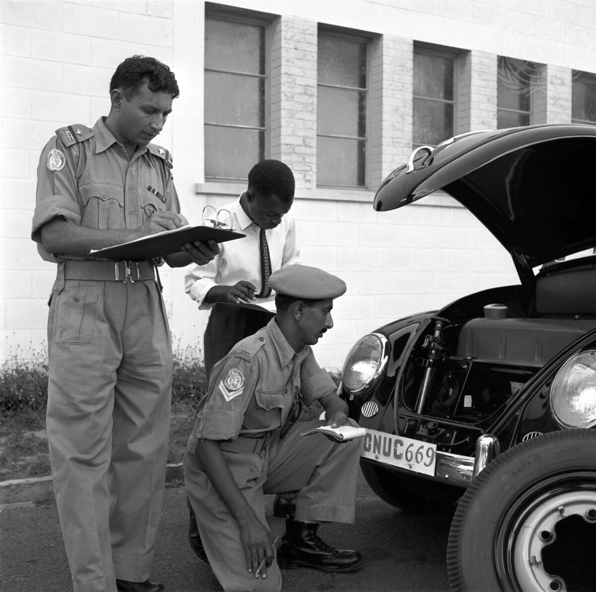 Here, W/O D.M. Faiz, Cpl. Mohamed Khan and the company agent, M. Makumbe (Congolese), check a new car being delivered at the Ordnance Depot, manned by members of the Pakistan unit.