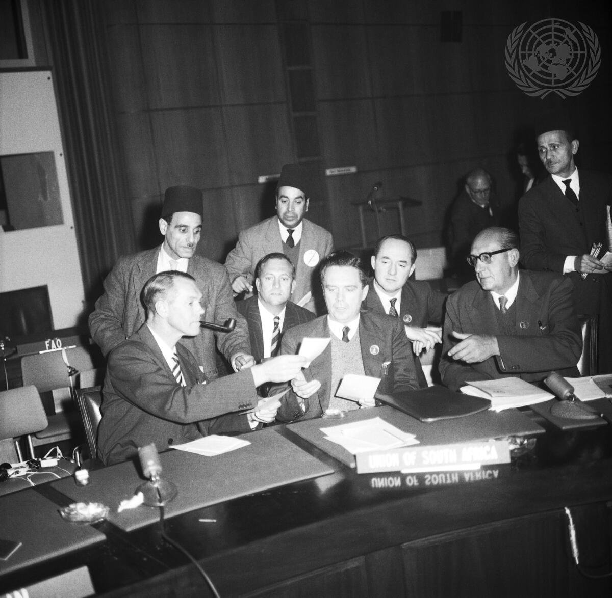C.B. Fourie (center), Head of the delegation of the Union of South Africa confers with his advisers (seated) over a note which has just been handed to him.