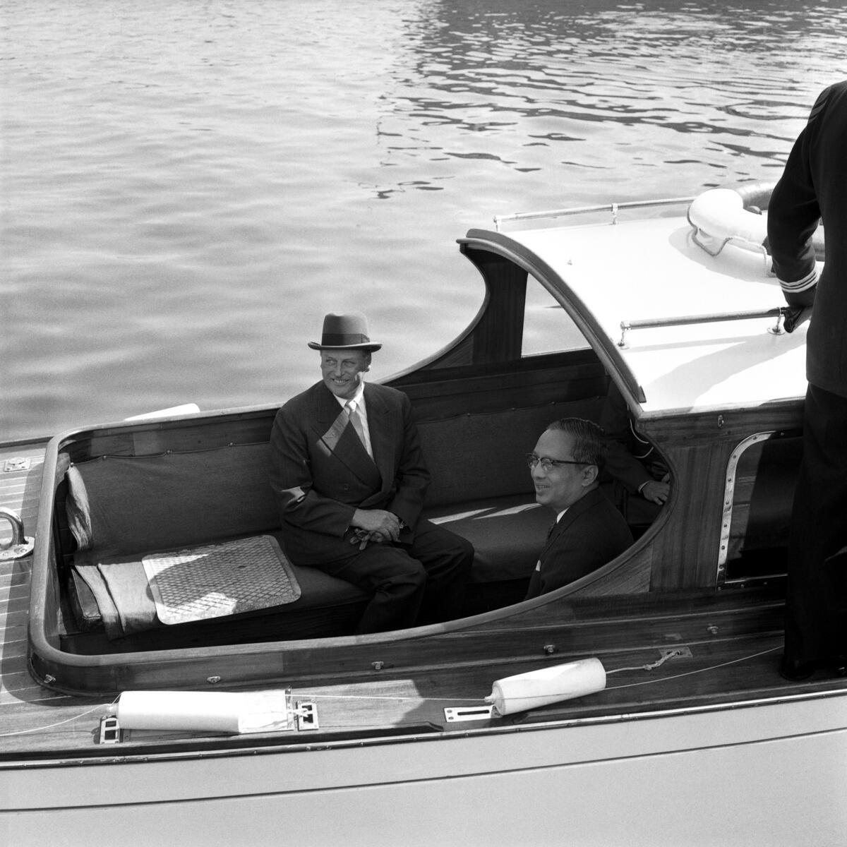 He is seen here with King Olaf V (left) on the launch which is taking them to the yacht.