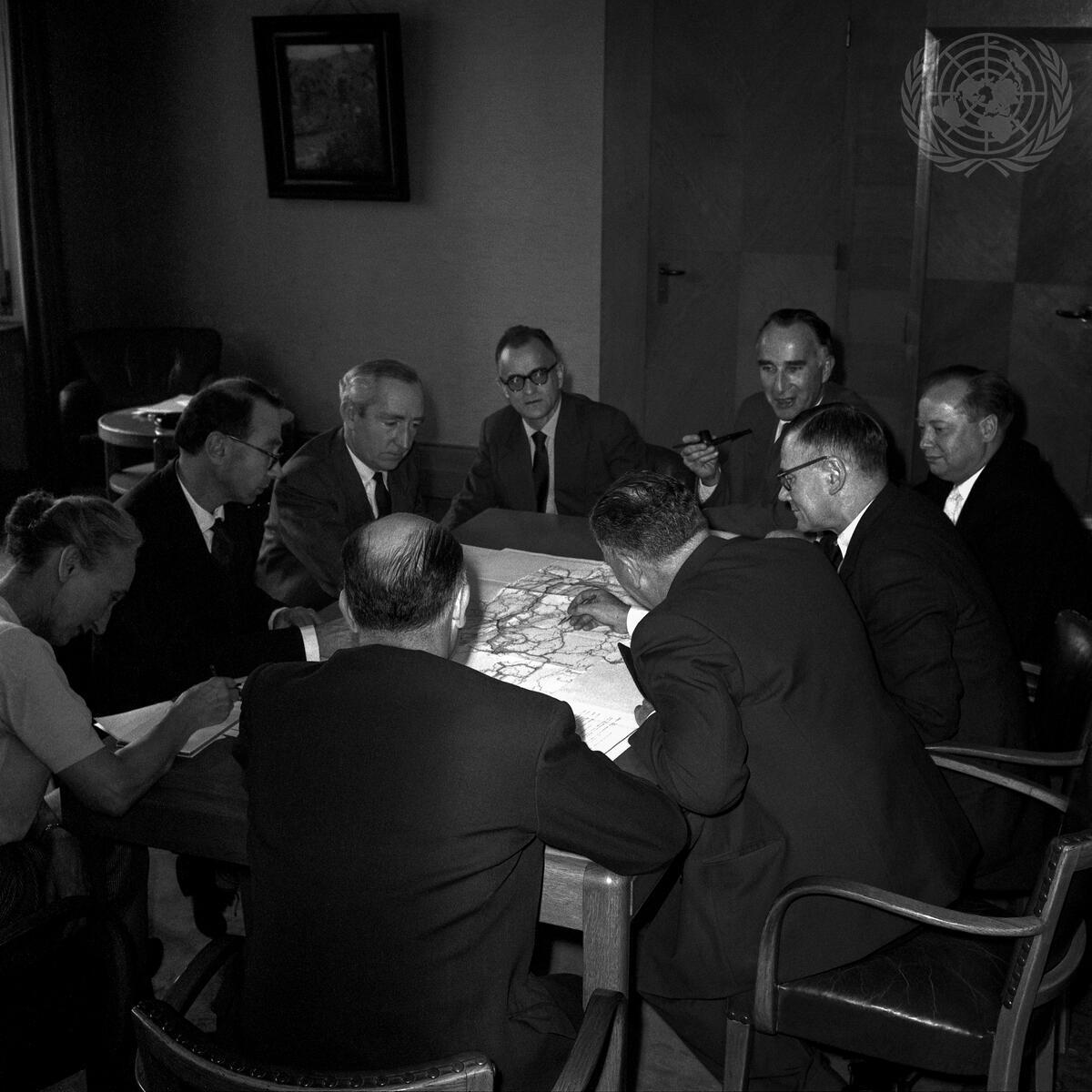 The staff of the Transport Division meet periodically to discuss their work, (l. to r.) clockwise, Miss O. Bigard, Mr. A. Adossides (Greece), Mr. J. Franciallard (France), Mr. W. Moser (Switzerland), Mr. A. Agafonov (USSR), Mr. A.D. Brant (U.K.), and Mr. F.D. Masson (U.K.).