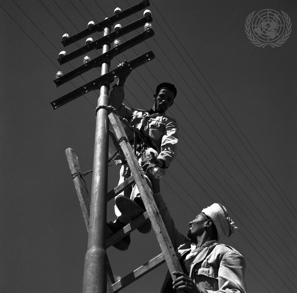 manage and operate the expanding network of communications. Shown here are ex-students, now linesmen, working on installation of additional telephone lines between Addis Ababa and a provincial town.