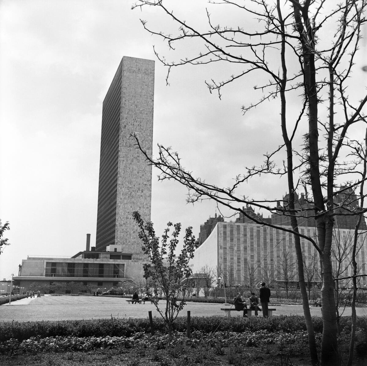 The three buildings seen on this picture house (from l. to r.) the conference rooms, the Secretariat offices, and the General Assembly auditorium. [No exact date]