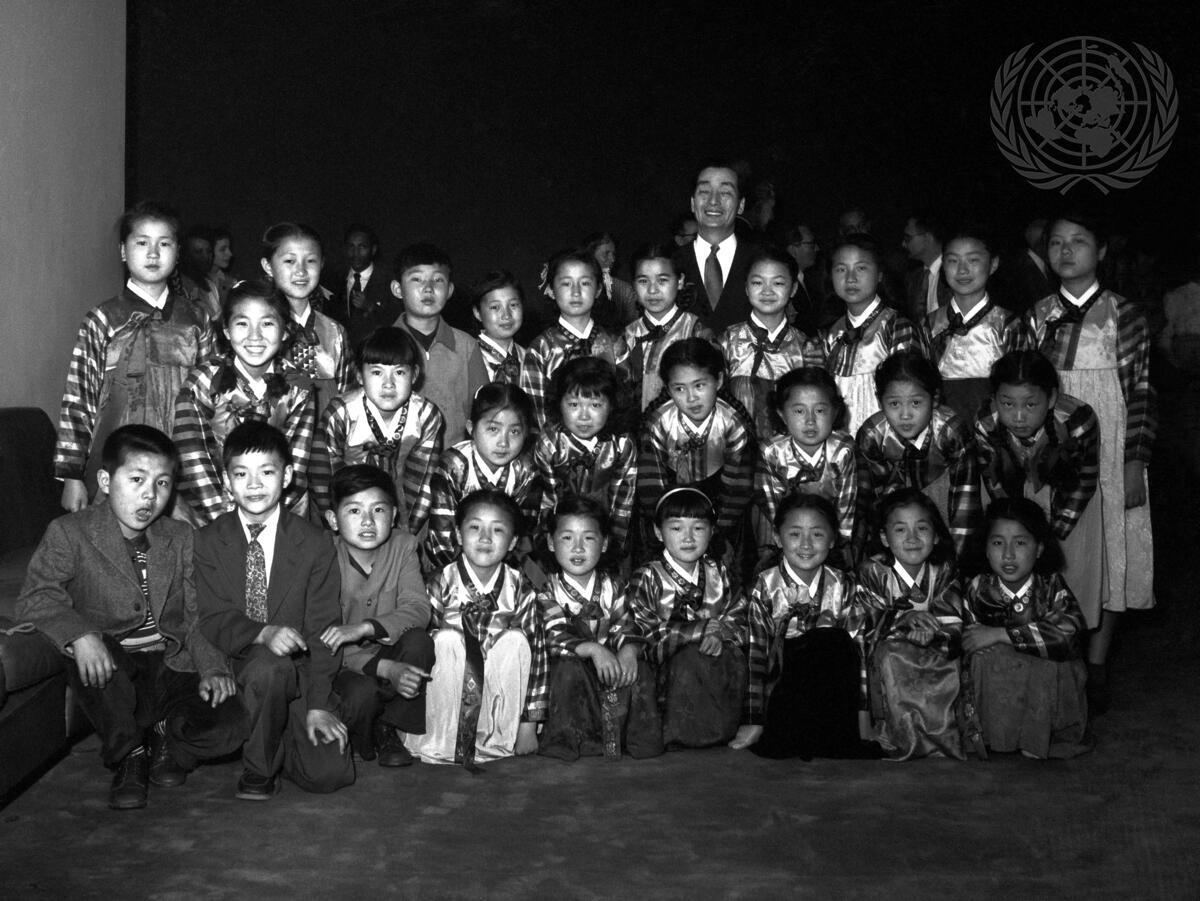 The Korean Children's Choir which is in the U.S. on a concert tour as part of a $10,000,000 fund drive for the rehabilitation of Korea, today visited United Nations Headquarters. The choral group is composed of twenty-two girls and three boys, ranging in age from 7 to 13 years. The group visited Headquarters as guests of the United States Committee for the U.N. Children's Fund (UNICEF) and sang greetings in Korean for the Committee which was reconstituted as an independent non-governmental organization on 21 April 1953.