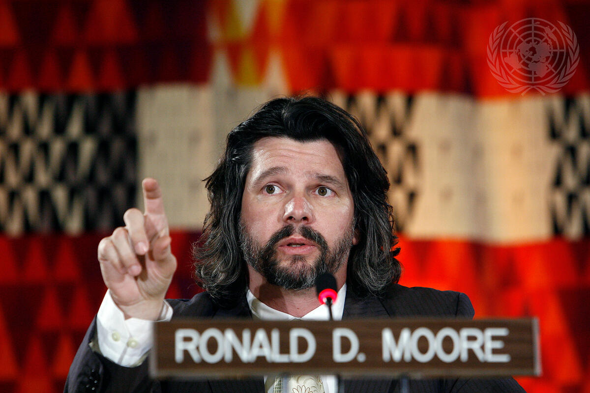 Ronald D. Moore, Executive Producer, participates in a panel discussion on ""Battlestar Galactica: A retrospective"" to examine the themes important to both the United Nations and the television show on human rights, children and armed conflict, terrorism and reconciliation among civilizations and faiths, moderated by Whoopi Goldberg, co-host of the television programme ""The View"" on the American Broadcasting Corporation.