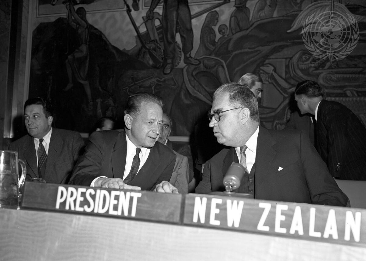 Sir Leslie Munro (right), of New Zealand, President of the U.N. Security Council, exchanging a few words with Secretary-General Dag Hammarskjold, today at U.N. Headquarters, before calling to order a meeting of the Council. The Council met to consider two proposals on the admission of 18 new members to the United Nations.