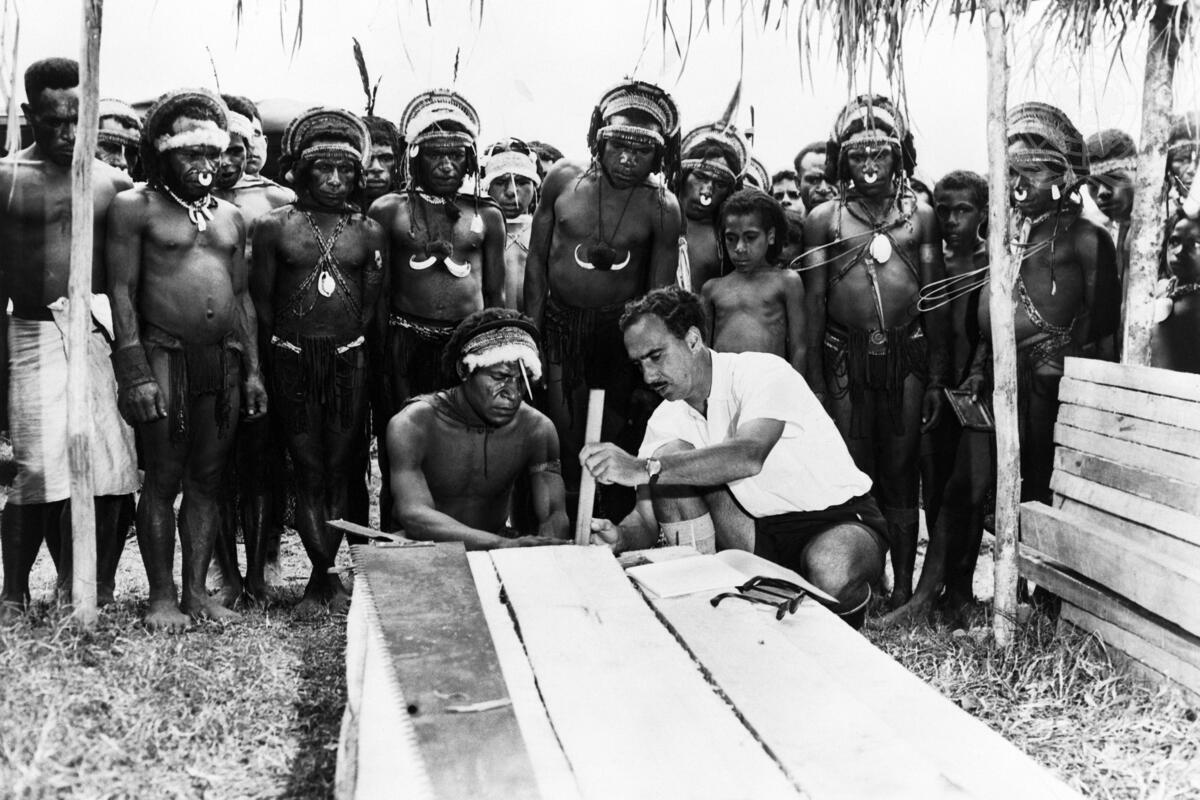 Here, villagers watch a district officer measuring their timber. (Read ""From Stone Age to Local Government in New Guinea”, in the July 1956 issue of the UNITED NATIONS REVIEW, for detailed information on the political development of that trust territory.)