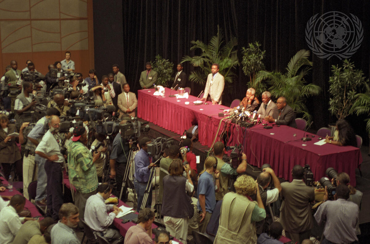 General view of the joint press conference given in Durban by (seated at table) Secretary-General Kofi Annan (centre), President Nelson Mandela (left) of South Africa and Salim Salim (right), Secretary General of the Organization of African Unity (OAU).