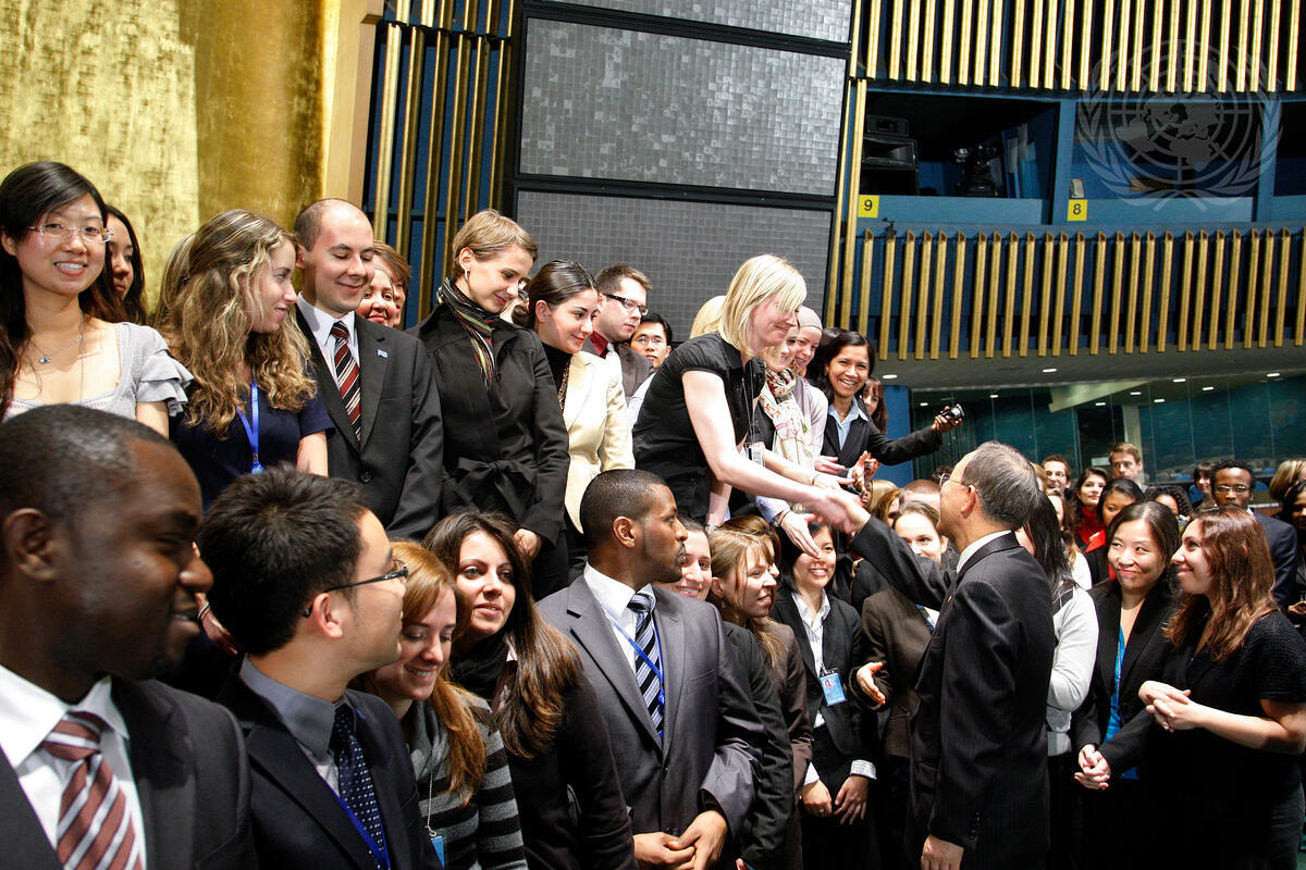 Secretary-General Ban Ki-moon (right) shakes hands with one of the participants of the winter session of the United Nations internship programme, after a group photo shoot in the General Assembly Hall.