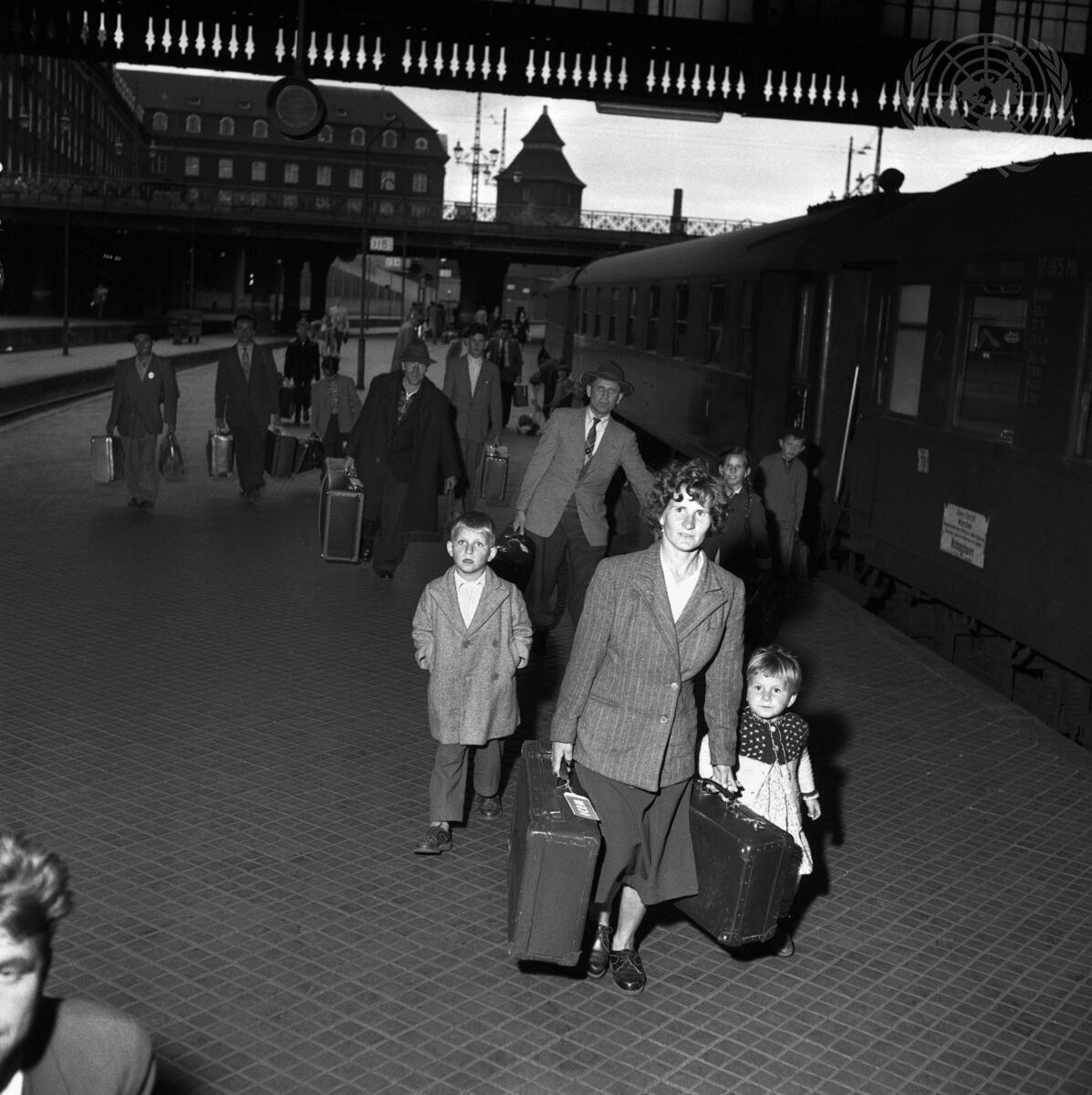 This picture shows a small group of selected refugees arriving at the Copenhagen railroad station, while on their way to Sweden. They are, from right to left, (foreground) Marta Kobilinski; Mokrina Kobilinski; and Wasilij Kobilinski; (behind them) Robert Sebler; Anneliese Sebler; Stefan Sebler; Jewstafi Kobilinski; and others.