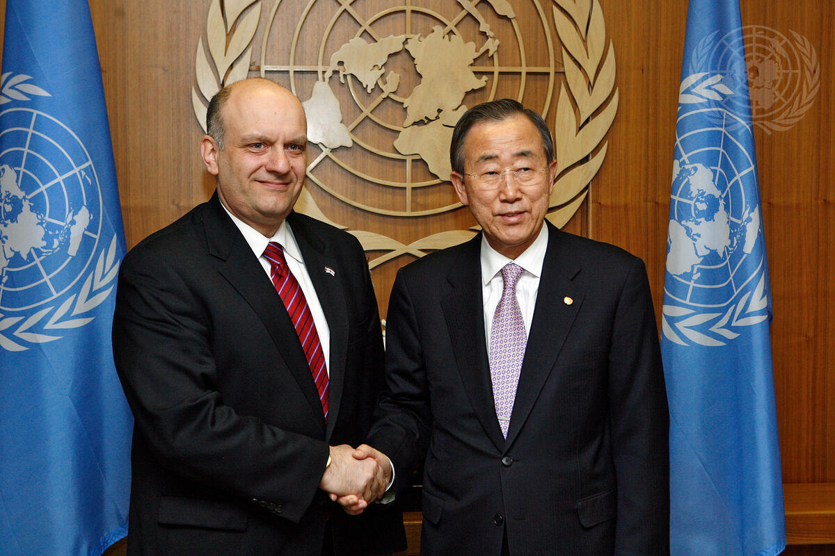 Secretary-General Ban Ki-moon (right) accepts the credentials of Alexander Lomaia, new Permanent Representative of Georgia to the United Nations.