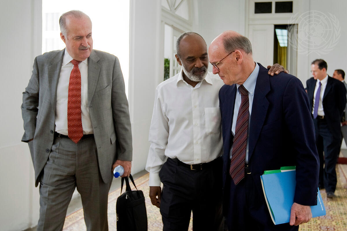 Hédi Annabi (third from left), Special Representative of the Secretary-General and Head of the United Nations Stabilization Mission in Haiti (MINUSTAH), confers with René Garcia Préval (second from left), President of Haiti, as Jorge Urbina, Permanent Representative of Costa Rica to the United Nations, and Head of the Security Council mission to Haiti, looks on.