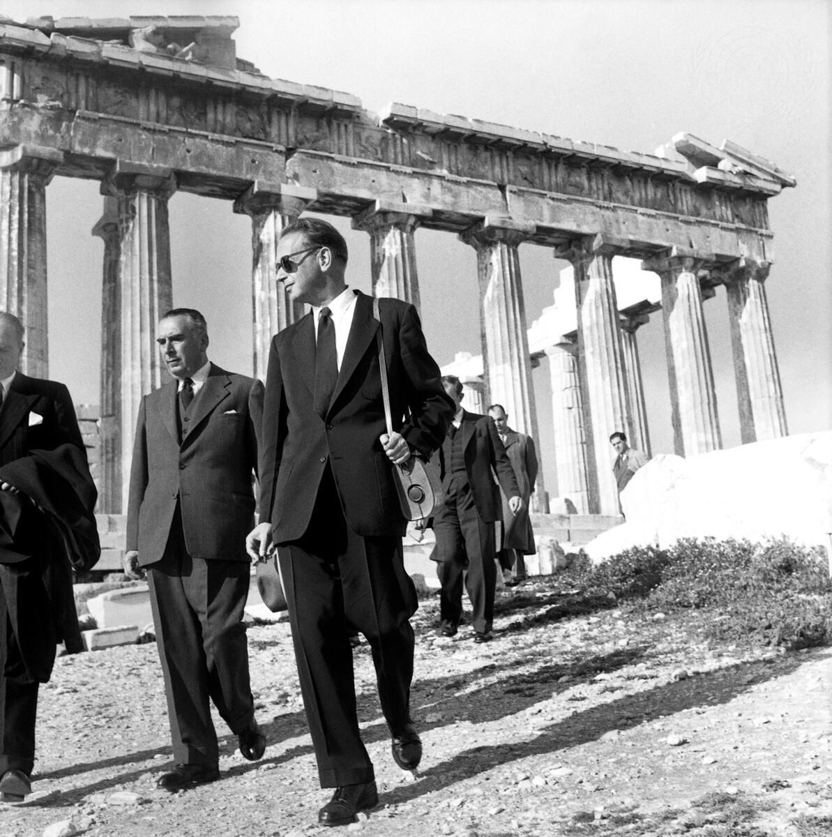 UN Secretary-General Dag Hammarskjöld (wearing glasses) and party during a visit to the Acropolis today. The Parthenon can be seen in the background.
